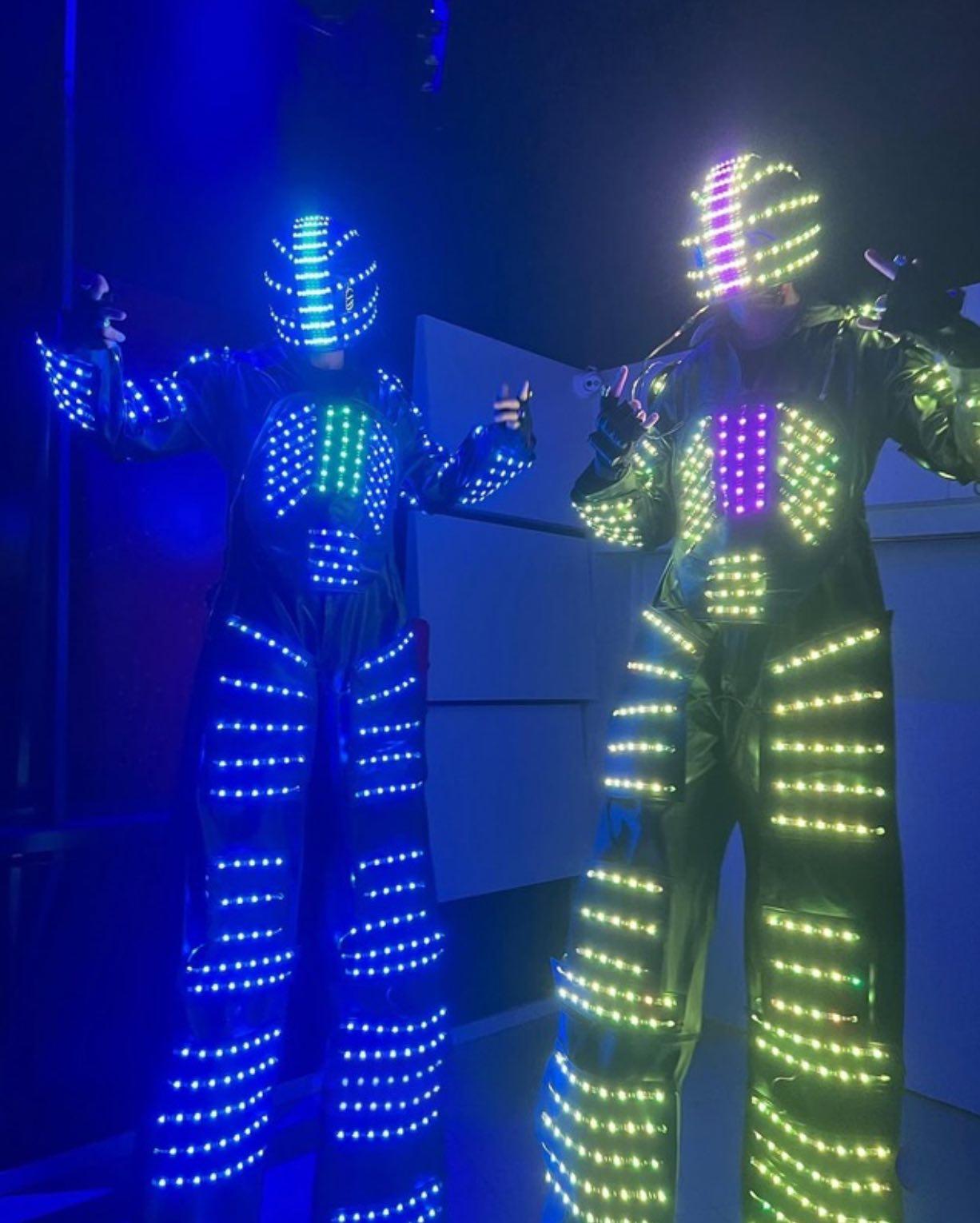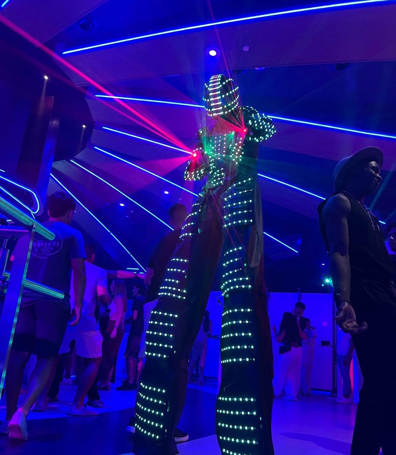 Nuestro traje más vibrante y espectacular, ideal para bodas, festivales o celebraciones nocturnas que buscan deslumbrar con energía y diversión. Las luces LED aportan un efecto visual sorprendente, convirtiendo cualquier pista de baile en un auténtico show de luz y movimiento.